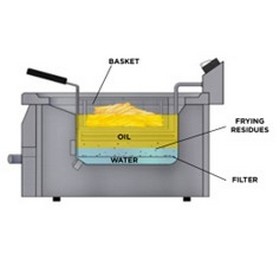 И так же есть водяные фритюры, где под маслом находится слой воды куда падают мелкие частицы которые не смогла удержать решетка и обгоревшая панировка которые просто тонут, благодаря этому мало остается чистым и служит дольше. Благодаря разнице в плотности масло не перемешивается с водой.